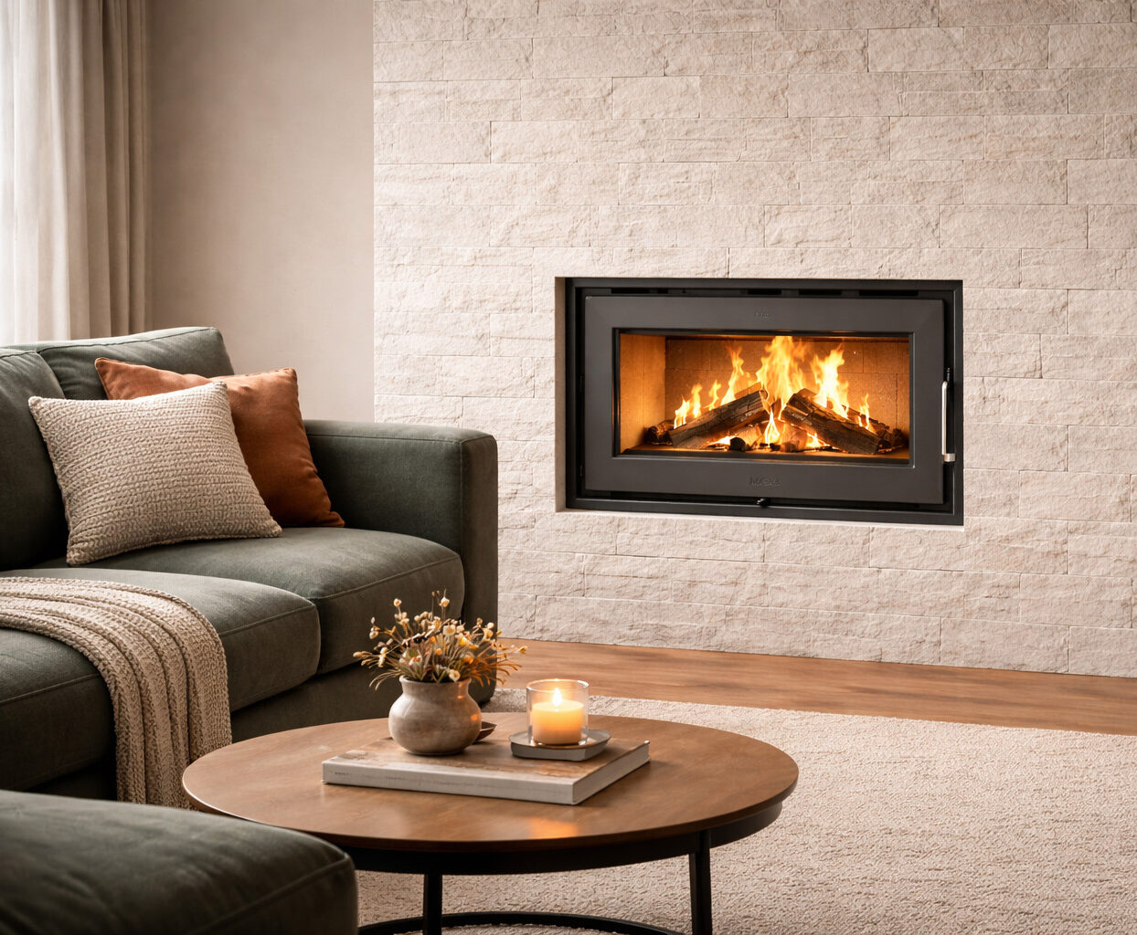 Gracias a su tecnología de combustión eficiente, logra una excelente capacidad de calefacción optimizando el consumo de leña y manteniendo el calor por más tiempo. Su diseño para instalación insertada en pared aporta una terminación moderna y minimalista, integrándose con armonía a distintos estilos de decoración.