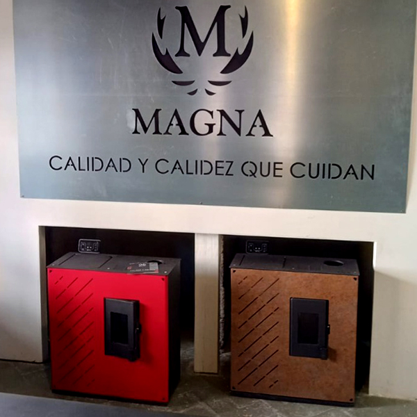 Construcción: Fabricada en acero soldado, con revestimiento de vermiculita de 15mm, logra las condiciones óptimas para la completa combustión de los pellets, generando rendimientos excelentes. El equipo pueden presentarse en negro, blanco o rojo, dando un toque de color al ambiente.