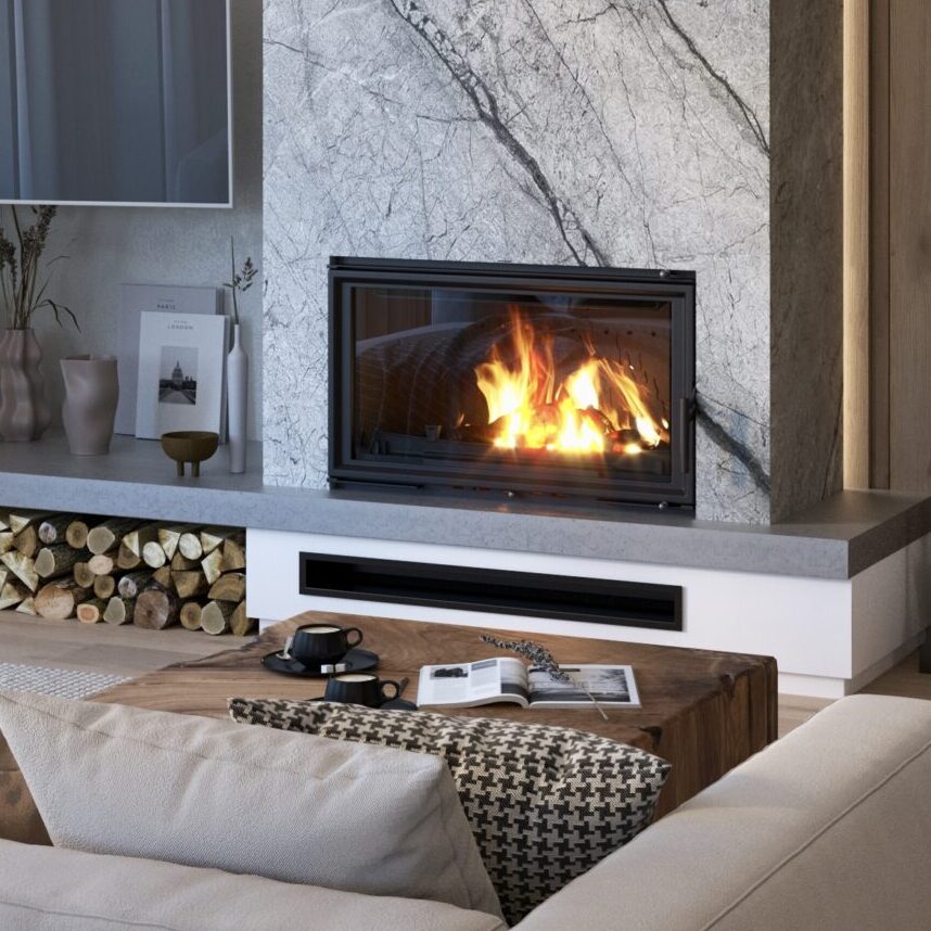 Terminación: Sólida puerta de hierro fundido, con cristal apaisado. El cuerpo de hierro fundido está protegido con una pintura para alta temperatura de un color negro grafito con muy poco brillo, lo que destaca sus líneas.